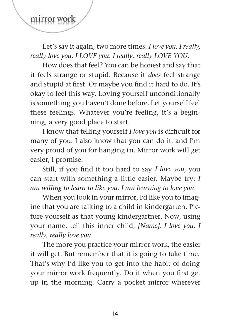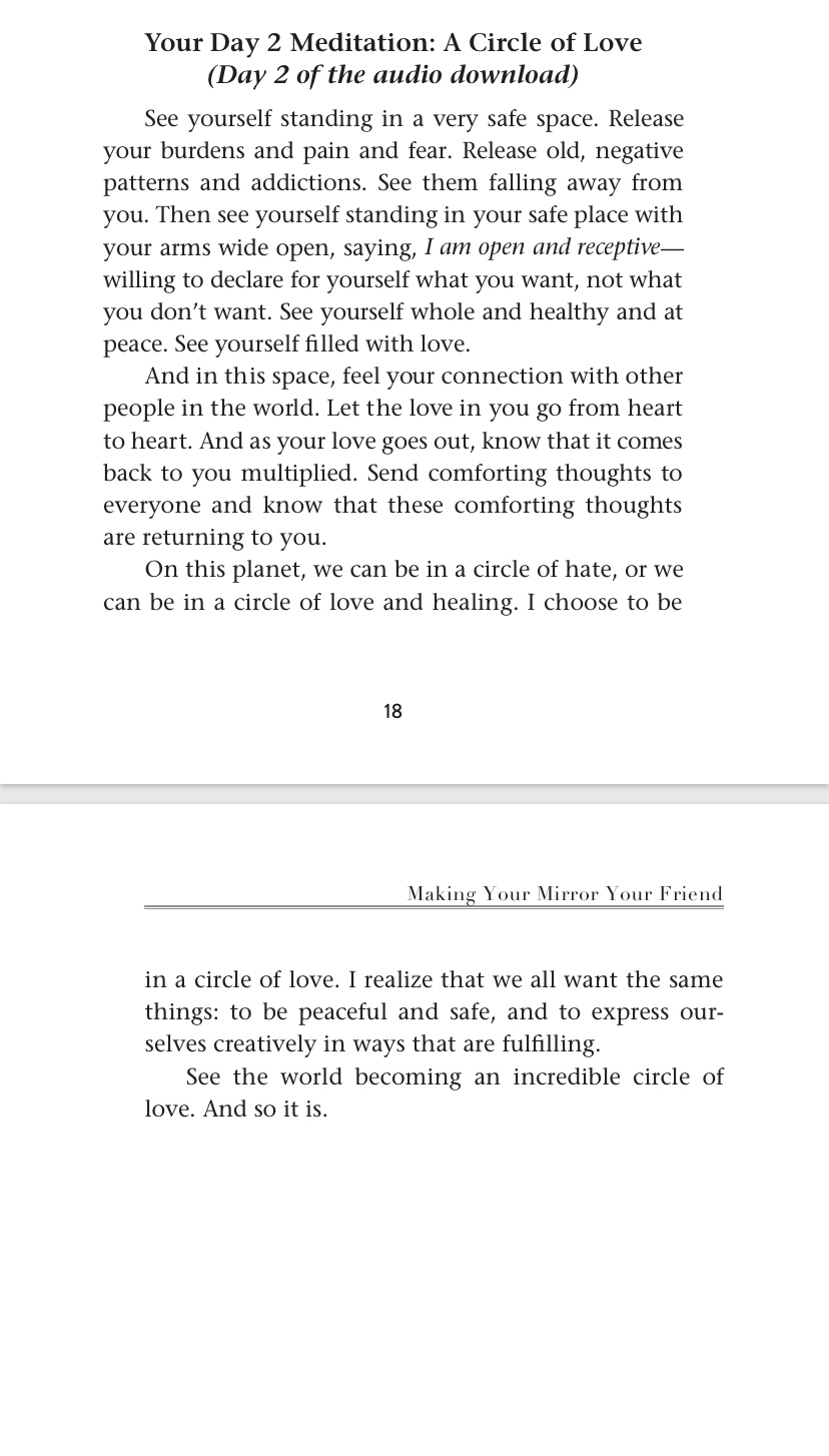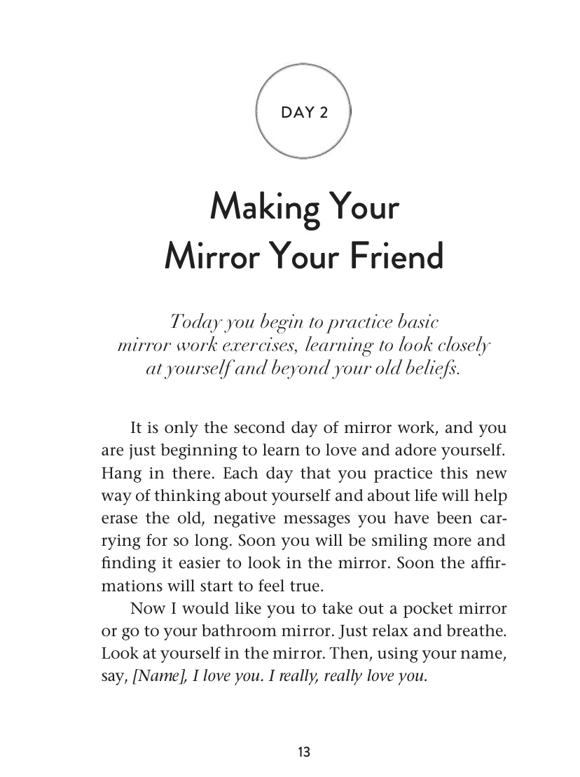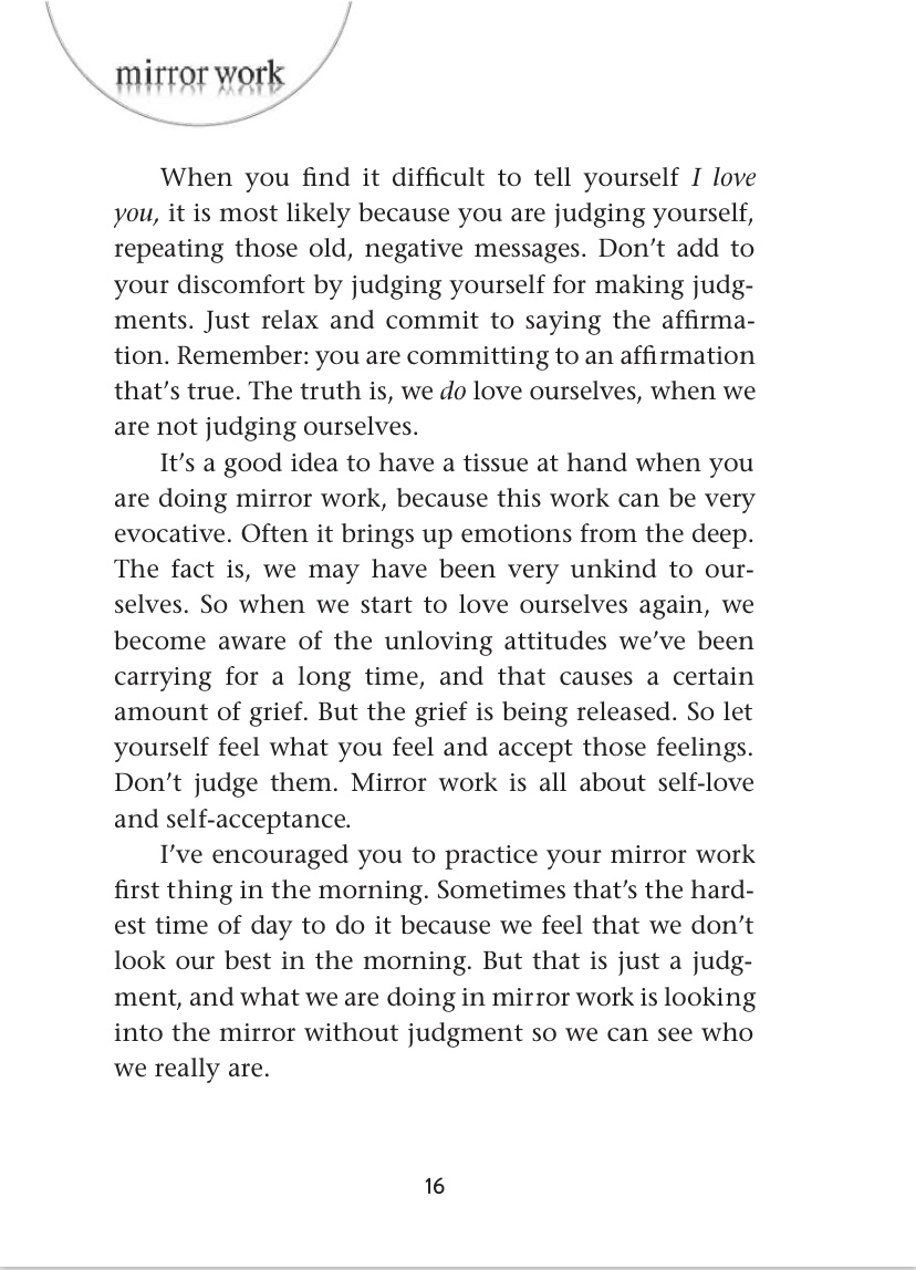 أقف قدام المرايا وبص لعنيك وردد (أسمك) وقول أنا بحبك أنا فعلا فعلا بحبك…كرر ده أكتر من مره…على مدار اليوم كرر الجمله حوالي ١٠٠ مره،كل ماتعدي قدام المرايا أو خلي معاك مرايا صغيره وكرر نفس الجمله