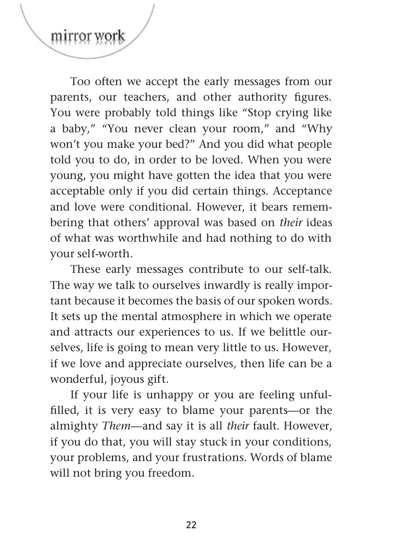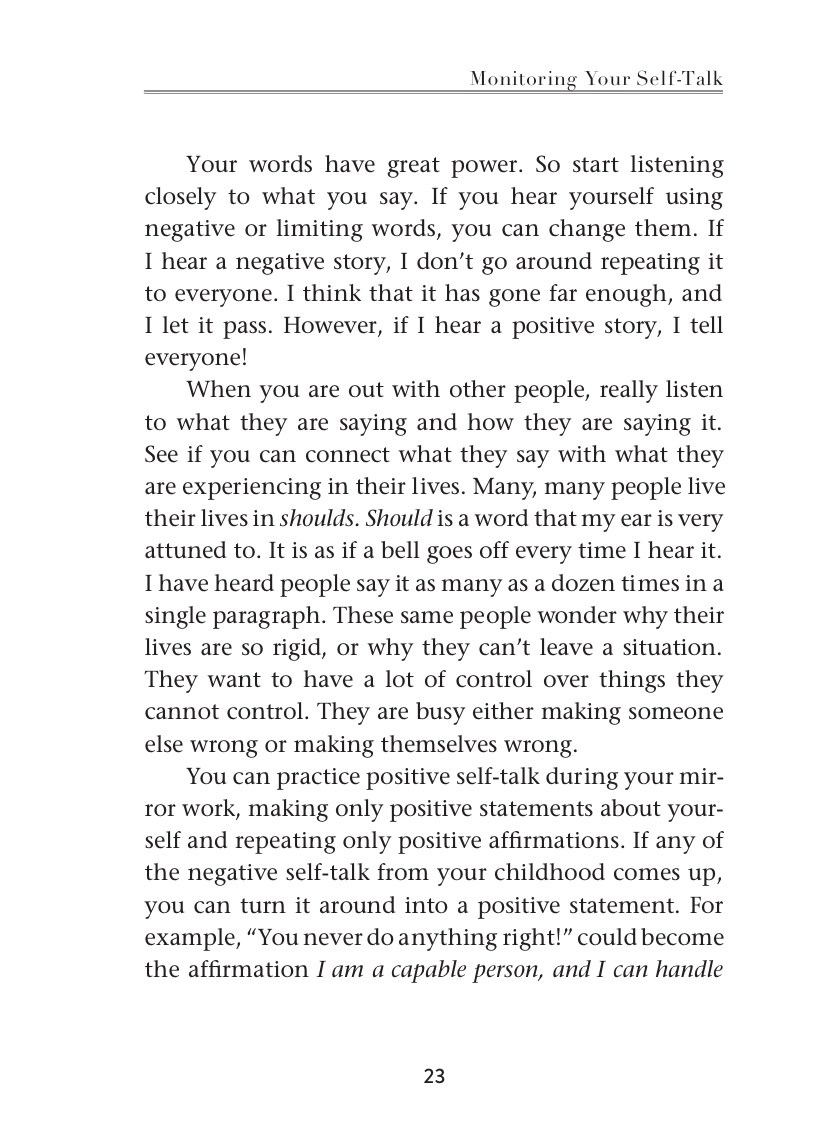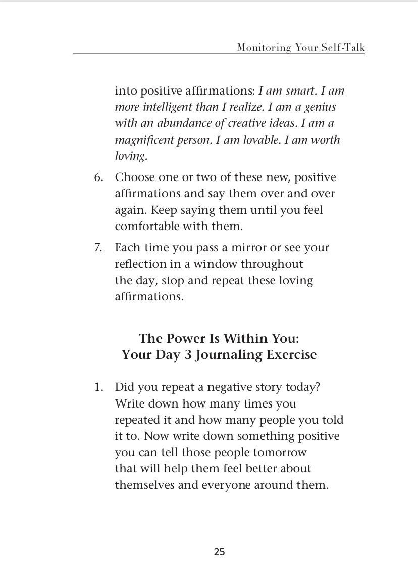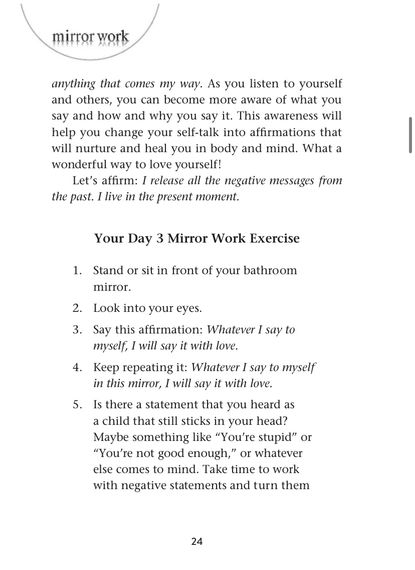 بص لنفسك في المرايا بص لعنيك كويس وردد” مهما كنت بقول لنفسي ومهما حصل فأنا بحب نفسي”كررها أكتر من مره وزود عليها” أنا بحب نفسي”….لو أفتكرت أي حاجه سلبيه كانت بتتقال لك وأنت صغير زي أنت غبي أو أنت فاشل…حاول تتغاضى عنها وكأنها محصلتش وقول بدالها” أنا ذكي وأذكى بكتير مما أعتقد أنا عبقري وممكن أخترع وأبدع…أنا إنسان أستحق الحب وأستحق الحياه…..ردد كده كتير على أد ماتقدر …كل ماتعدي قدام مرايا أو خللي معاك مرايا صغيره…١٠٠ مره خد نفس عميق وردد الكلام الإيجابي ده