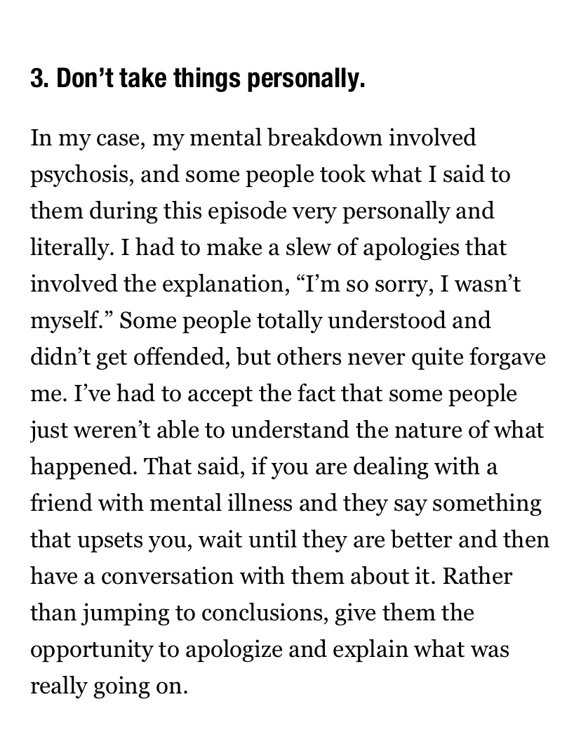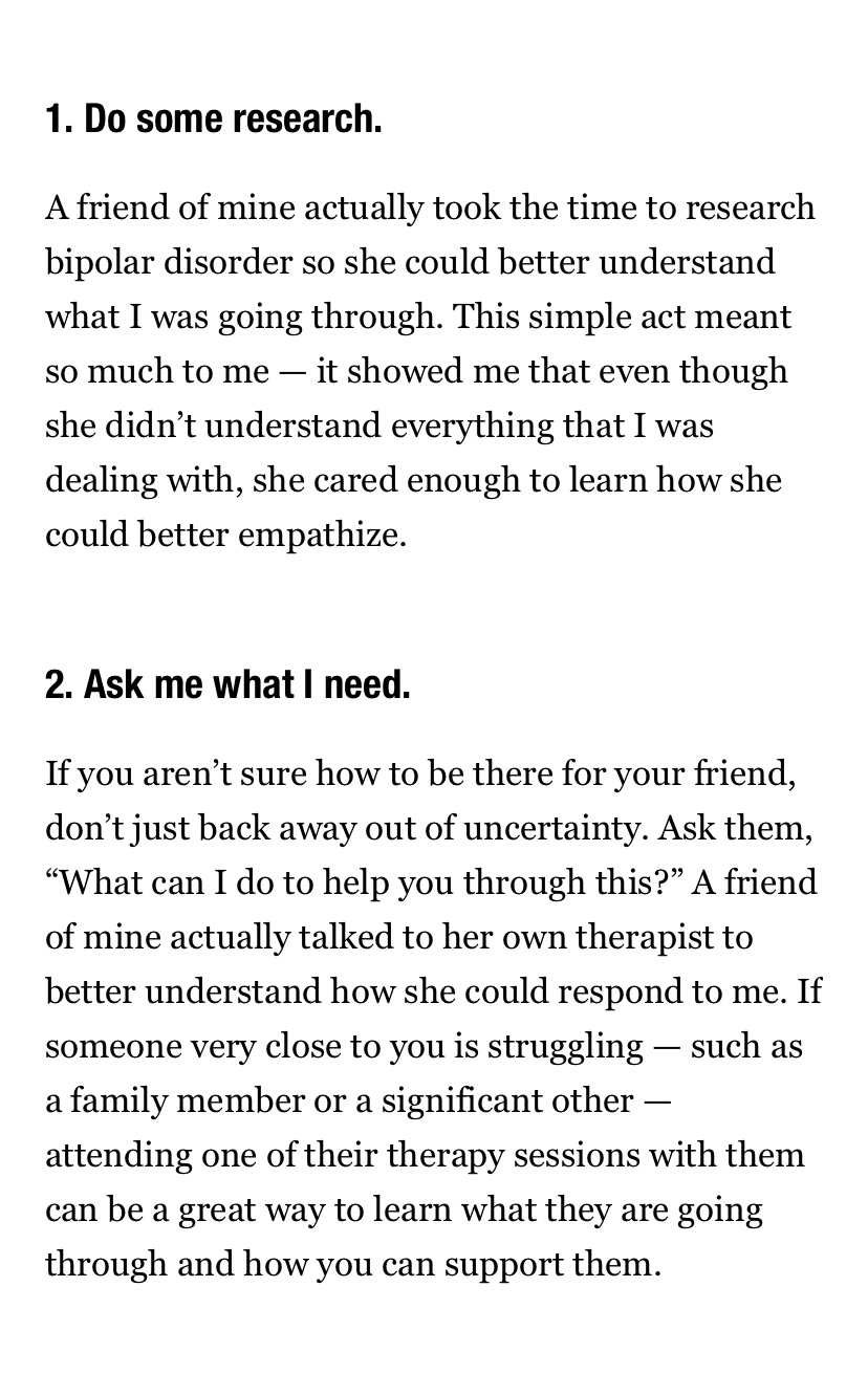 One of the challenging things about a mental health crisis is that often, even the people that care about you aren’t quite sure how to be there for you. After getting diagnosed with bipolar disorder, I lost a lot of friends during a time when I most needed support from them.