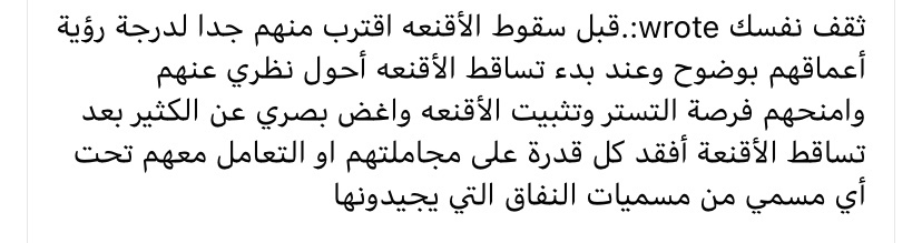 قبل سقوط الأقنعه اقترب منهم جدا لدرجة رؤية أعماقهم بوضوح وعند بدء تساقط الأقنعه أحول نظري عنهم وامنحهم فرصة التستر وتثبيت الأقنعه واغض بصري عن الكثير بعد تساقط الأقنعة أفقد كل قدرة على مجاملتهم او التعامل معهم تحت أي مسمي من مسميات النفاق التي يجيدونها
